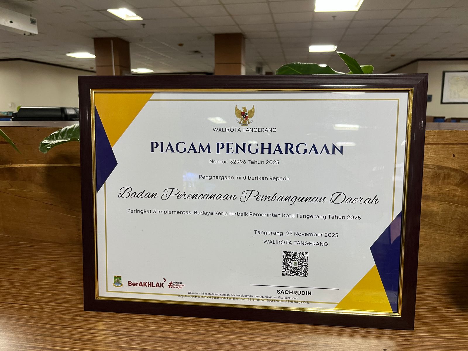 Piagam penghargaan diserahkan langsung oleh Wali Kota Tangerang, H. Sachrudin, dan diterima oleh Kepala Bappeda Kota Tangerang, Hj. Yeti Rohaeti.
